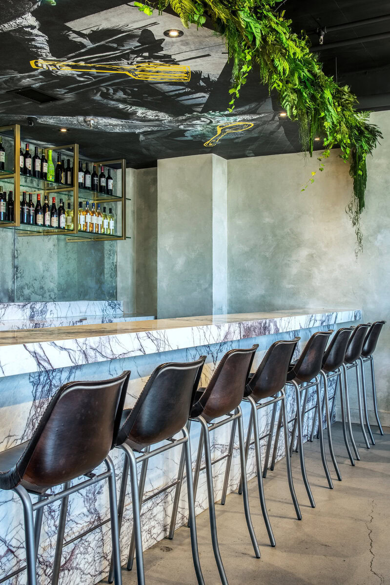 We envisioned M8 as a sensory journey that would reflect the innovative culinary artistry of its talented young chef. Our design concept marries the raw elegance of industrial elements with the lush vibrancy of tropical influences, creating a space that feels both sophisticated and welcoming. The concrete floors and exposed ceiling infrastructure provide an honest architectural foundation, while our carefully curated material palette—featuring distressed antiqued mirrors, teal velvet upholstery, and artisanal wicker seating—adds layers of texture and visual intrigue throughout the space.